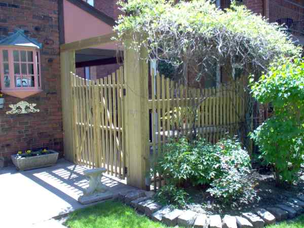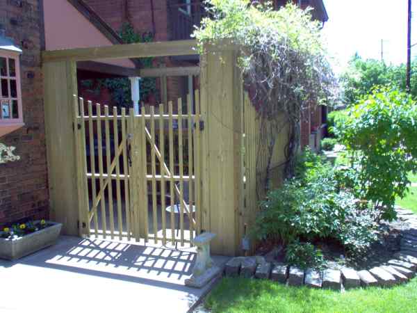 A gate was necessary because of the foot traffic on the main street. The owner wanted the option to add a pergola or canvas cover later. That's why it's built a little sturdier than usual. The real problem in building this was the wisteria vine on the upper part of the fence area. The vine comes from a cutting from the owner's grandfathers home. It's impossible to replace. There was an old wood trellis supporting it originally. So the old trellis had to be removed in pieces and the new fence built without damaging the vine.